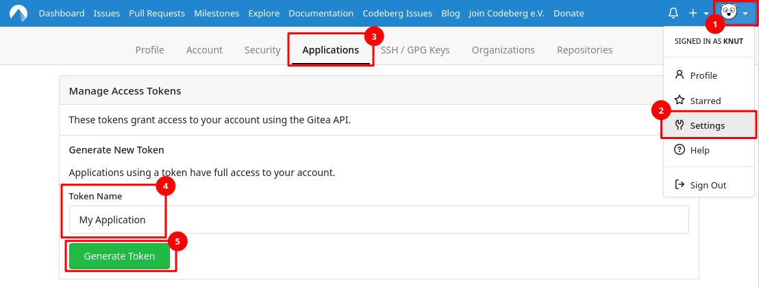 This guide explains how to generate an access token from the website. However, you can also generate access tokens from the API. Read more at Forgejo's documentation.