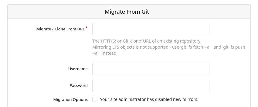 To migrate a repo with its metadata from a different service, you will first need to create an access token on the service with your repository. Please check your services documentation, on how to get the access token. Examples can be found for GitLab and GitHub. Don't forget to delete the access token once you are finished.